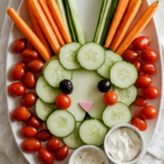 It is bright, crisp, and full of natural flavor. Crunchy cucumbers, sweet cherry tomatoes, and fresh carrots surround a creamy dip that ties everything together. Trust me, you are going to love this. It is fun to make, easy to serve, and it disappears quickly at Easter parties.