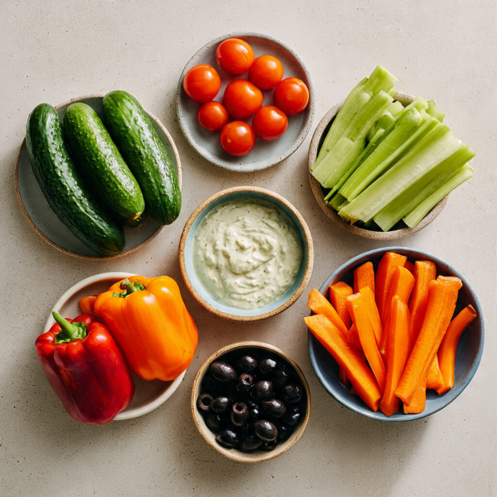 The creamy dip adds richness that balances the vegetables. Together they create a snack that feels light but still satisfying.