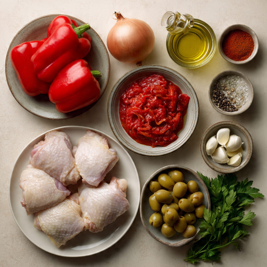 Tender chicken thighs simmered in a rich tomato and red pepper sauce with sweet smoked paprika and briny green olives, finished with fresh parsley for a comforting Andalusian-inspired meal.