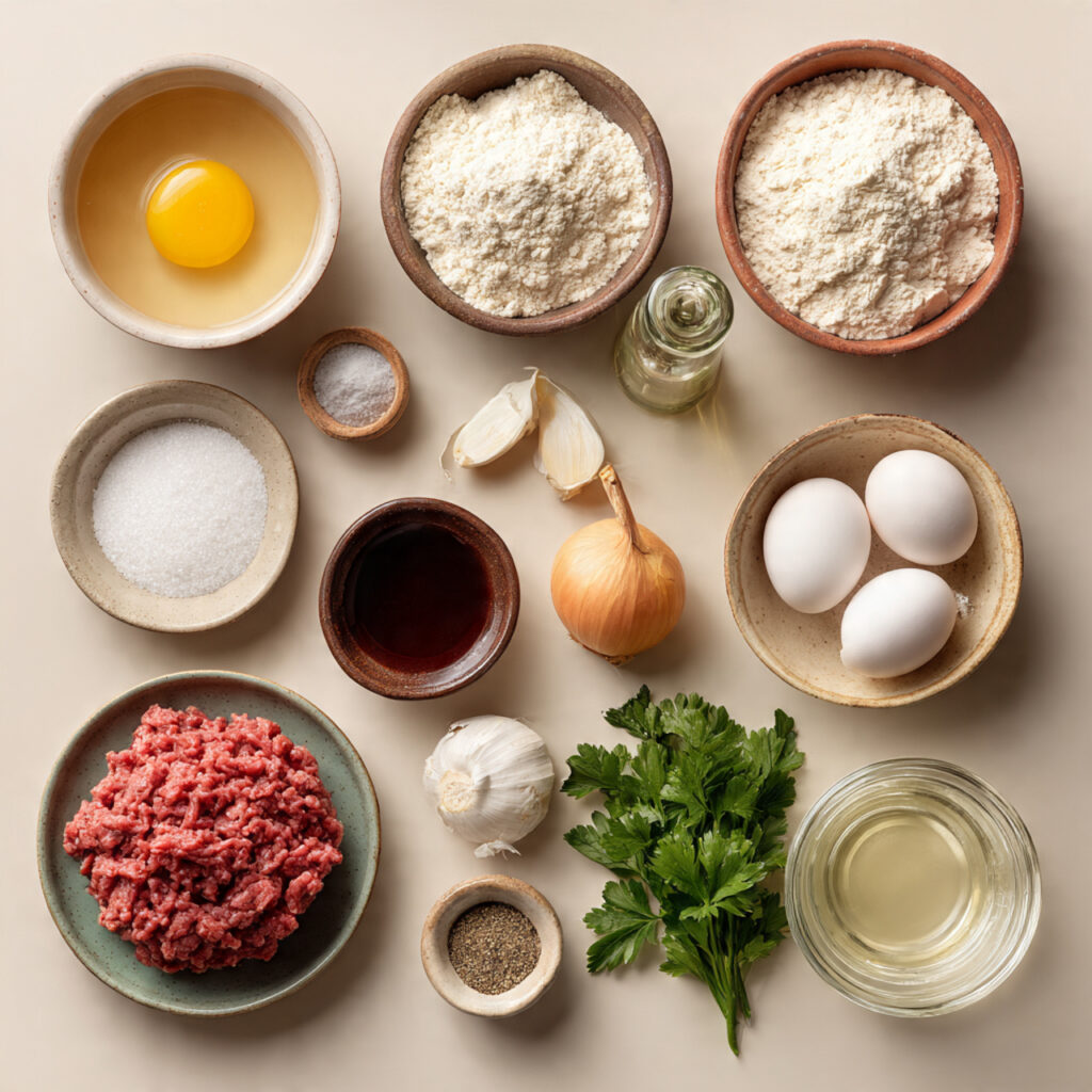 - Ground lamb or beef: 200 grams — The savory heart of each dumpling.