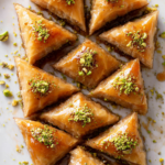 Classic baklava made with delicate phyllo pastry layers filled with pistachios and soaked in sweet honey syrup.