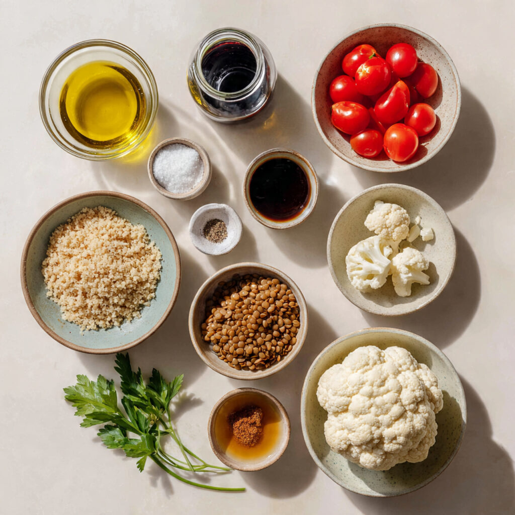 - In a large bowl, combine bulgur, lentils, cherry tomatoes, and steamed cauliflower.