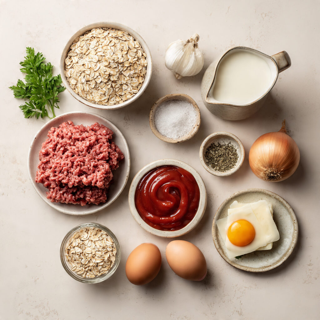 - Ketchup: ½ cup (divided) — Used inside and on top for flavor and that signature glaze.