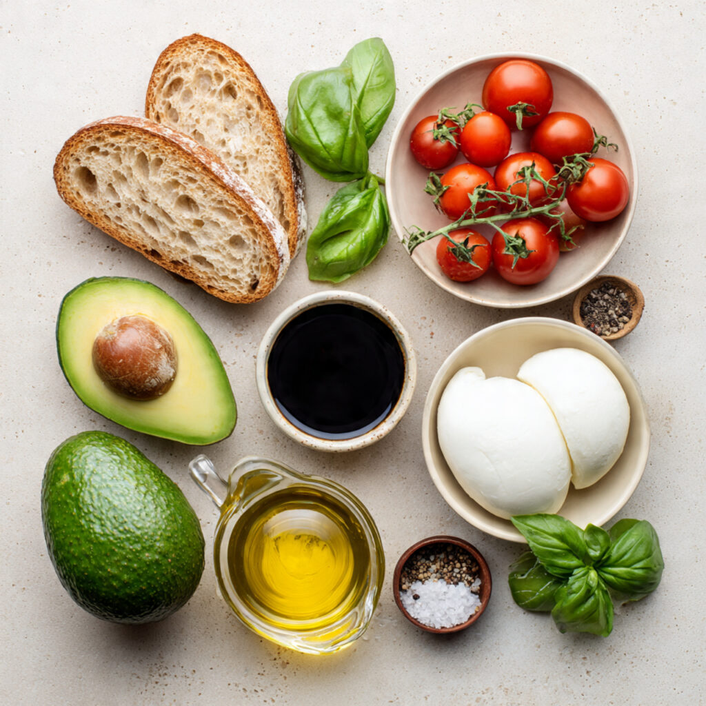 This one came to life on a slow Sunday morning. You know those kinds of mornings where the sunlight pours in just right, and you’re craving something fresh but also deeply satisfying? I had a few ripe avocados, a handful of sweet cherry tomatoes, and some leftover mozzarella from the night before. As I layered everything together on a slice of golden toasted sourdough, I took a bite and instantly knew… this was something special. Simple, yes, but packed with flavor and soul.