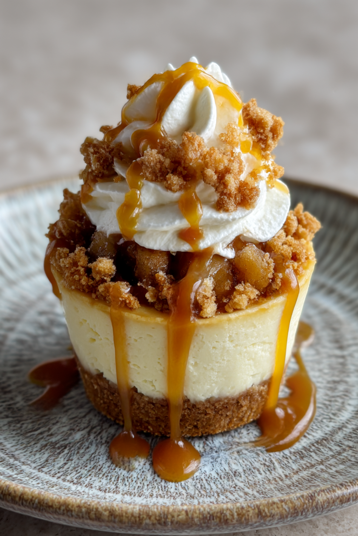 Mini cheesecake cups layered with buttery graham crust, creamy filling, spiced apple topping, and finished with a rich caramel drizzle. The perfect fall dessert in bite-sized form.