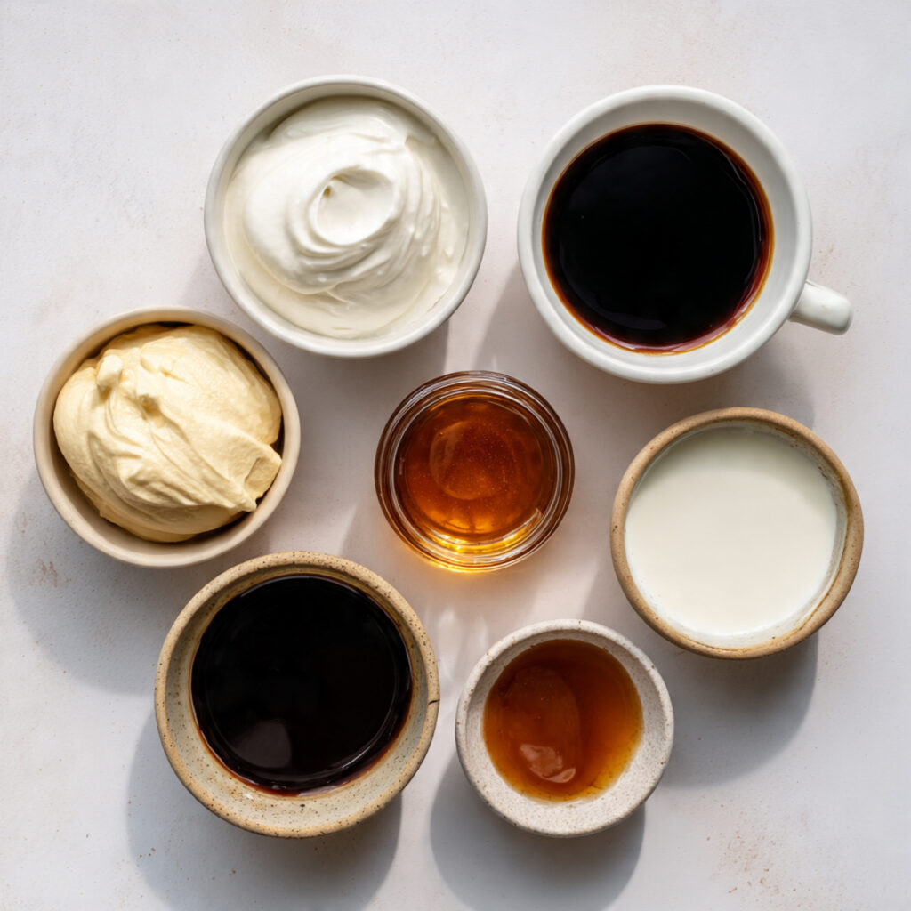 - Espresso or Strong Coffee: ¼ cup, cooled. Infuses the base with bold coffee flavor.