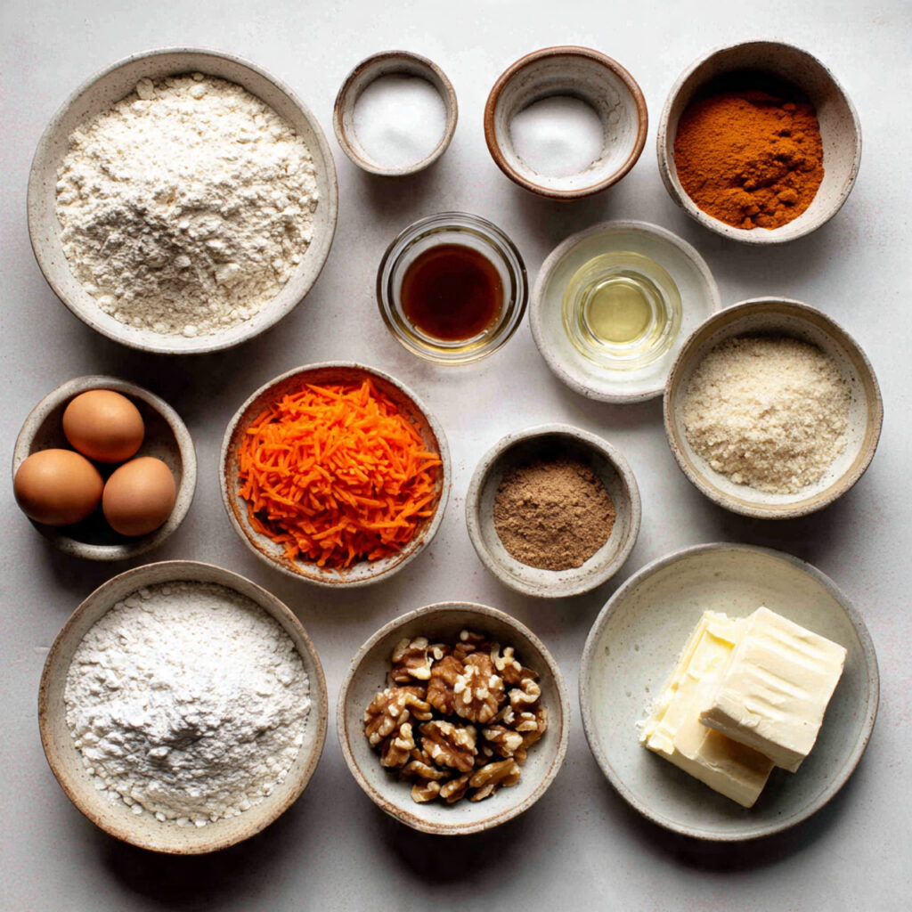 - Grated Carrots: 1 ½ cups – Moisture and natural sweetness.
