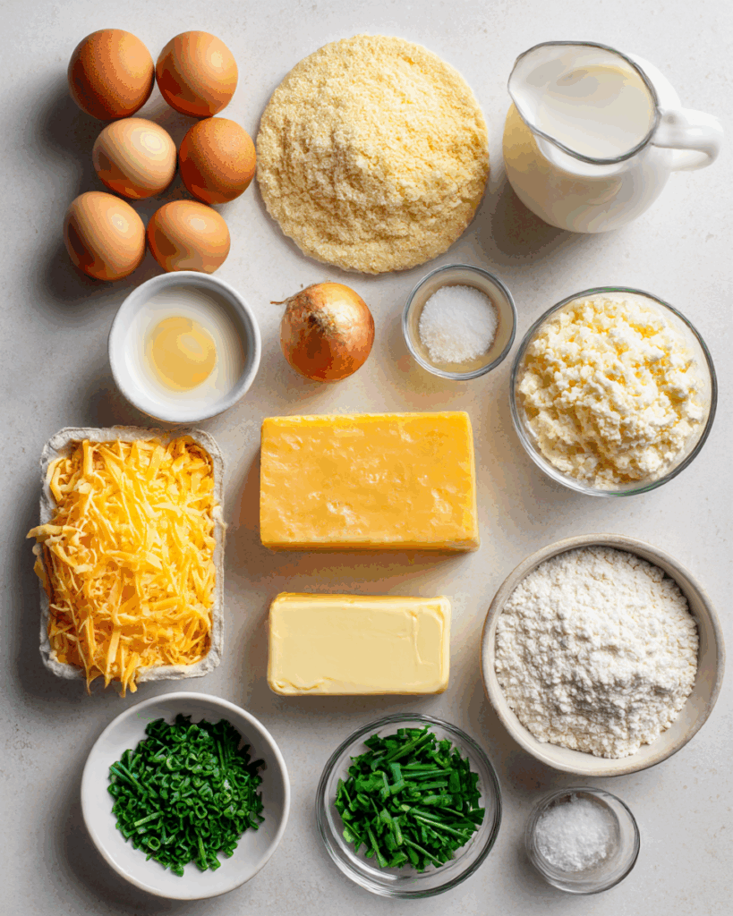 - Combine Ingredients: In a pan, melt butter and cook onions on low for 15–20 minutes until golden. In a bowl, whisk eggs, milk, cream, cheeses, and salt.