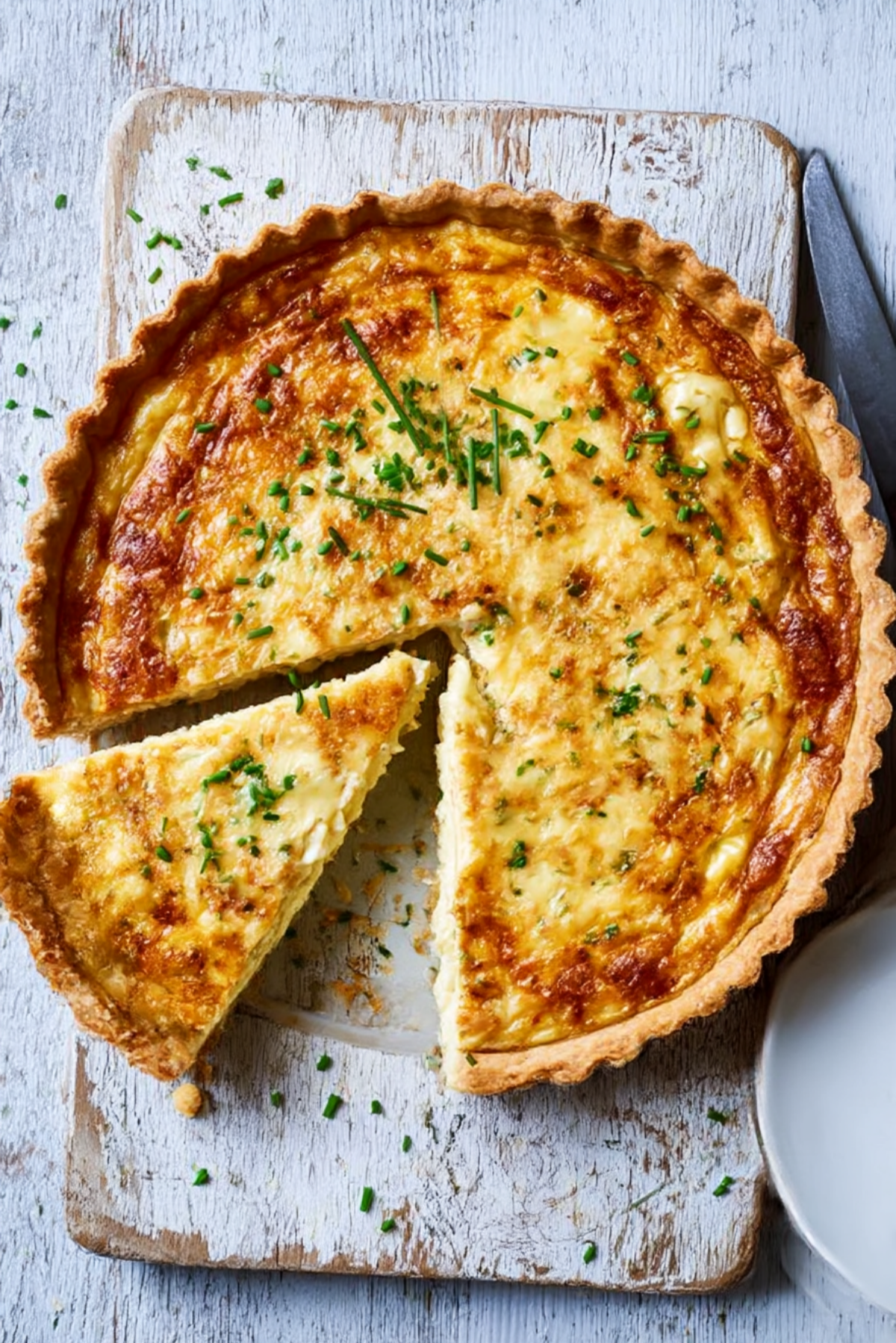 - Assemble the Dish: Blind-bake for 15 minutes, remove weights and bake 5 minutes more. Spread onions in base, pour in custard, sprinkle chives.
