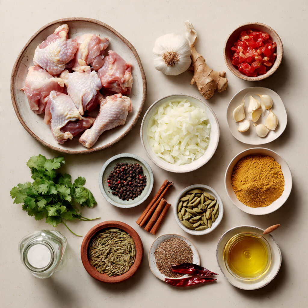- Chicken (bone-in pieces): 1 kg – Absorbs the masala and releases rich juices into the gravy.