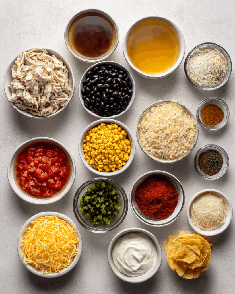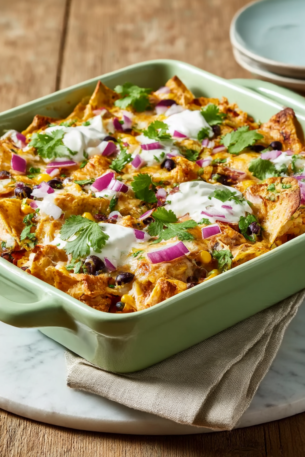 A comforting, cheesy, Tex-Mex inspired casserole that combines shredded chicken, black beans, corn, tortilla chips, and melted cheese into one easy, flavorful dump-and-bake dinner.