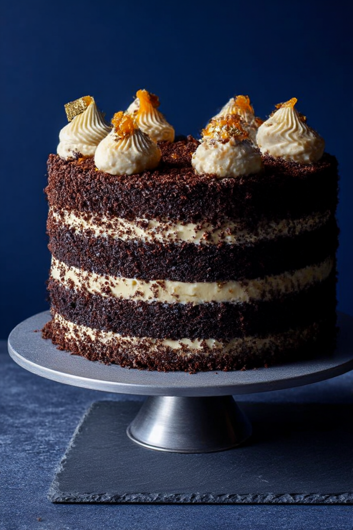 Presentation is everything. Use a white cake stand to make the dark cake pop. Garnish with candied orange slices, curls of zest, and edible gold for a luxe touch. Slice cleanly with a hot knife for bakery-worthy cuts.
