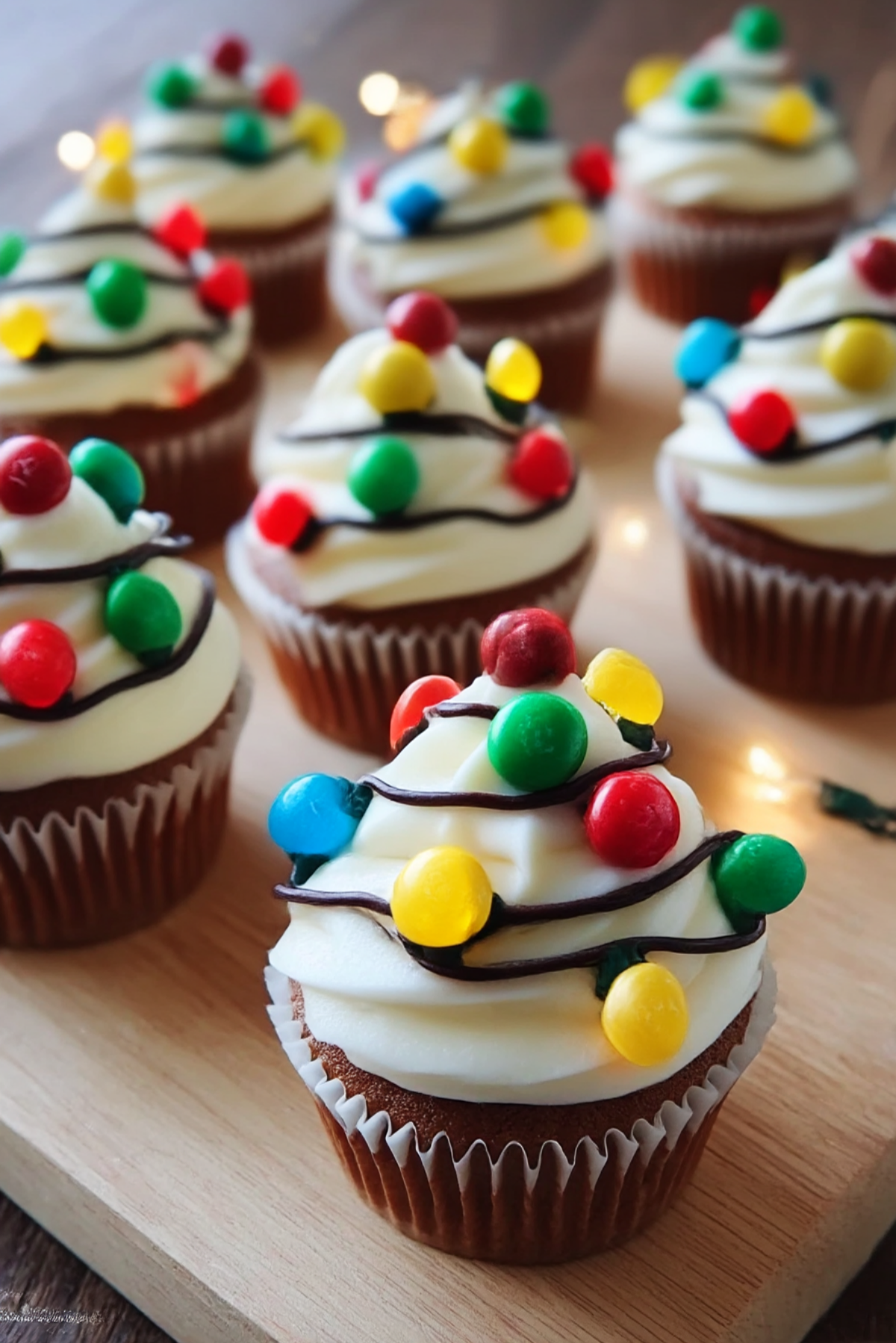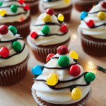 These Christmas Tree Light Cupcakes are a festive holiday treat featuring moist chocolate cupcakes topped with swirls of vanilla frosting and decorated with colorful candy lights. Perfect for holiday parties, bake sales, or family fun.