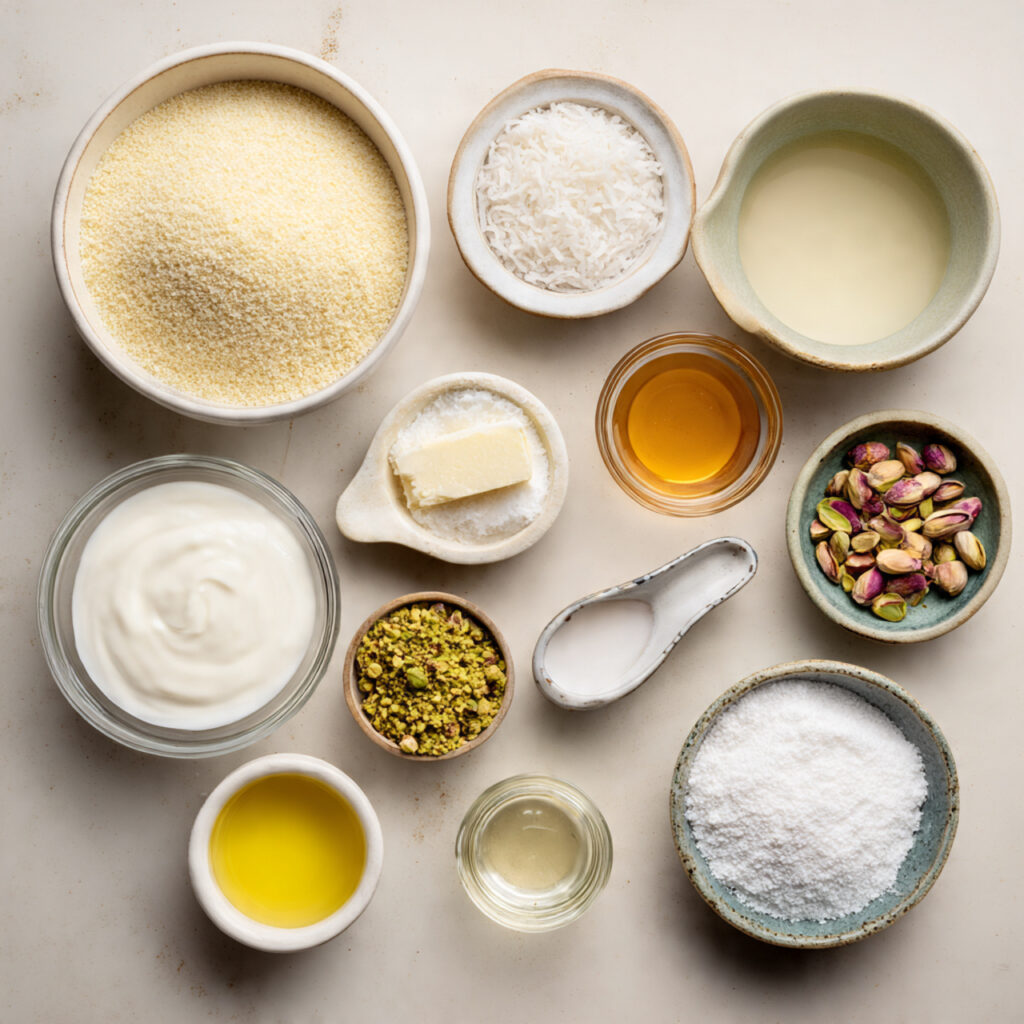 A moist, golden semolina cake infused with coconut and topped with pistachios, soaked in a fragrant sugar syrup for the perfect Middle Eastern dessert experience.