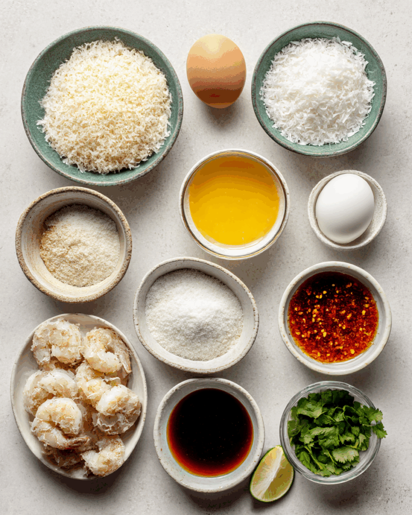 - Assemble the Dish: Dredge each shrimp in flour, then egg, then coconut mixture. Press gently to coat well.