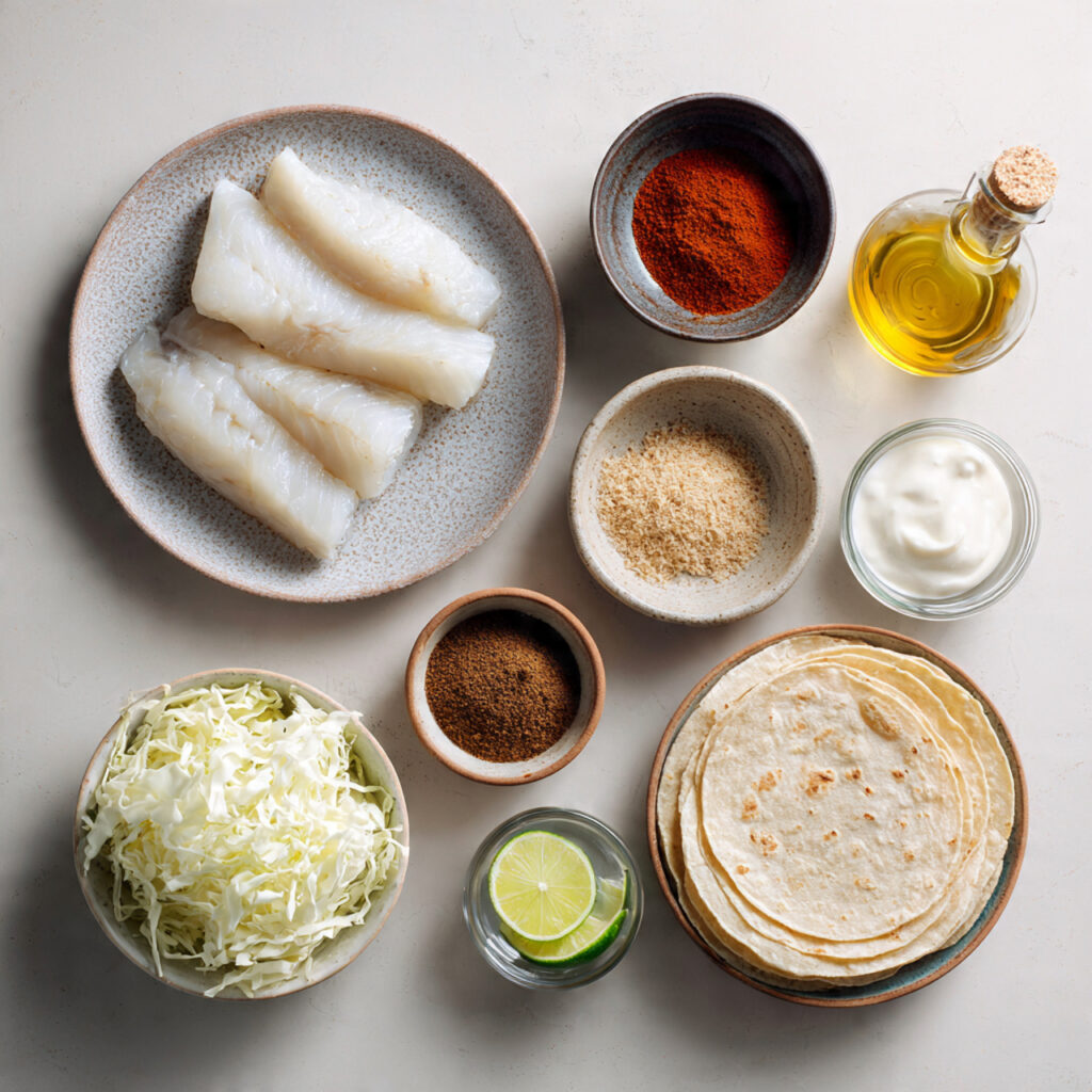 Cook fish for 3–4 minutes per side or until cooked through and flaky. Remove and rest. In a separate bowl, toss shredded cabbage with lime juice. Mix mayo or yogurt with hot sauce for the taco sauce. -