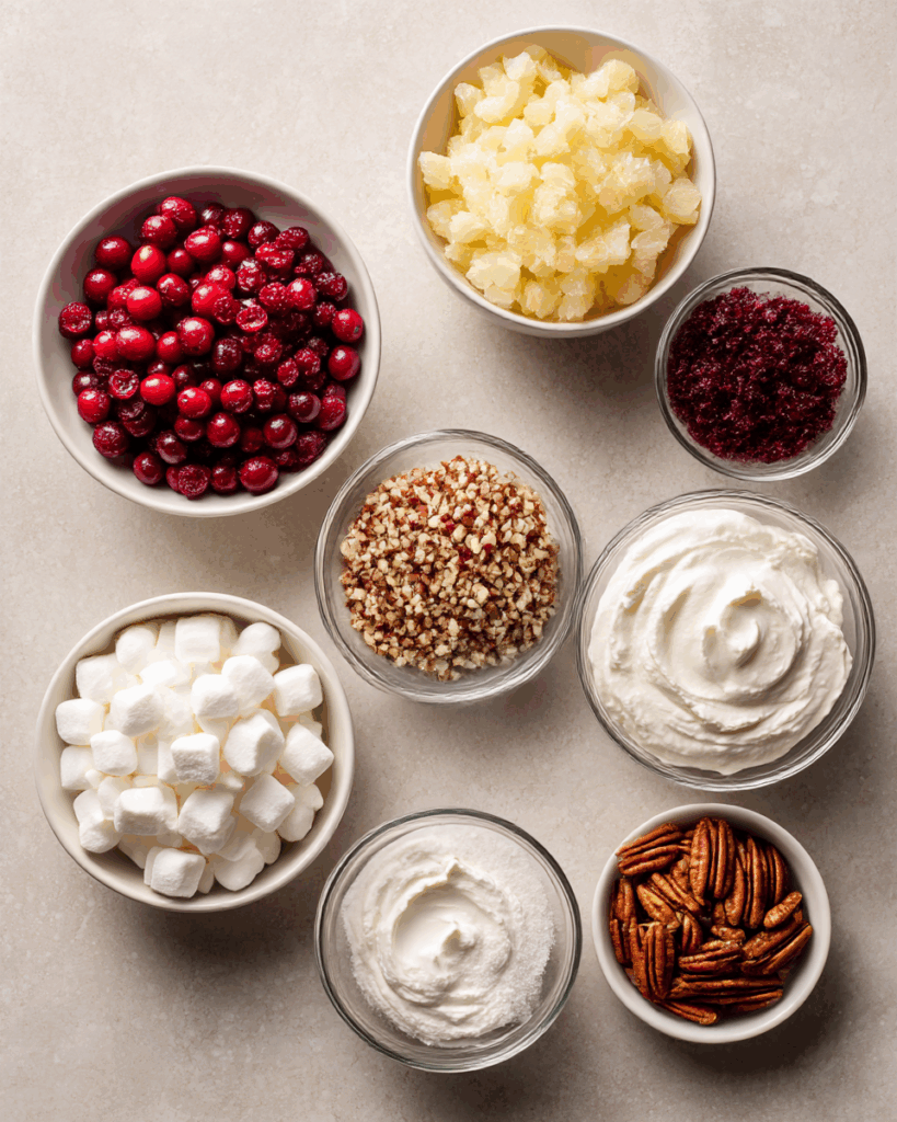 The magic of cranberry fluff lies in its contrasts. You’ve got the chew of marshmallows, the pop of juicy fruit, the crunch of pecans, and that soft cloud-like creaminess holding it all together. The tangy cranberries play beautifully with the sweetness of pineapple and sugar, giving every spoonful a perfect balance.