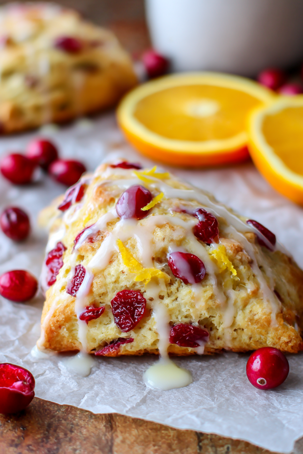 These scones are tender and slightly crumbly, with buttery layers and juicy pops of cranberry. The outside develops a subtle crunch while the inside stays soft and rich. The orange glaze adds a citrusy kiss that pulls the whole bite together.