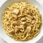 The noodles are soft and silky, coated in a light, buttery style sauce that clings to every strand. The chicken stays tender, and the garlic adds just enough depth to keep things interesting. It is simple, but incredibly satisfying.