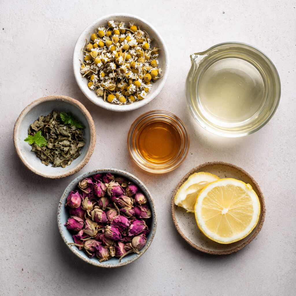 - Combine Ingredients: Add chamomile, rose petals, and mint to the teapot or an infuser placed in your cup.