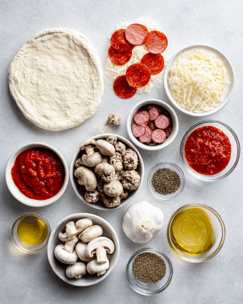 - Pizza Dough: 1 pound – The sturdy base that holds all the layers with a buttery, slightly crisp texture.