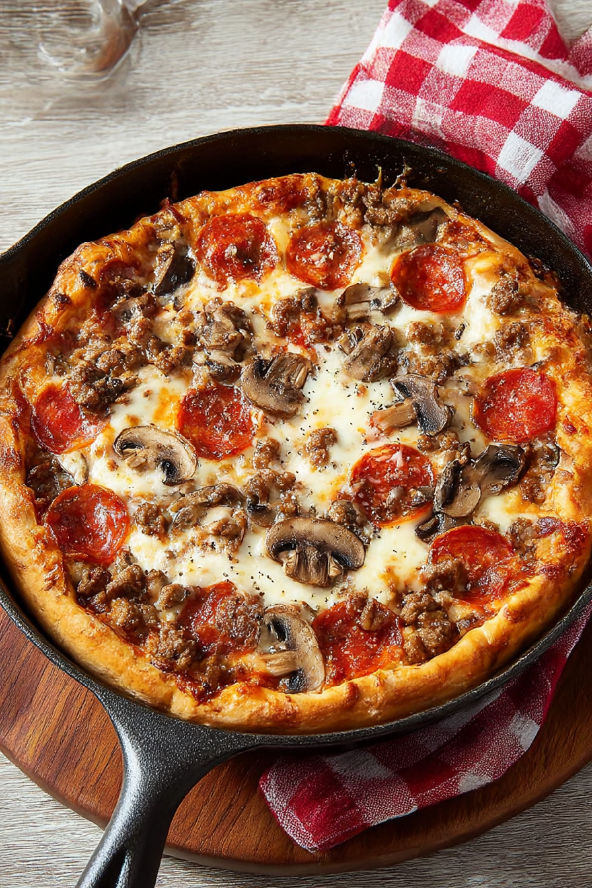 This Deep-Dish Pizza is thick, cheesy, and packed with savory layers of sausage, pepperoni, and mushrooms beneath a bold tomato sauce. A hearty, Chicago-style pie that’s perfect for sharing or savoring solo.