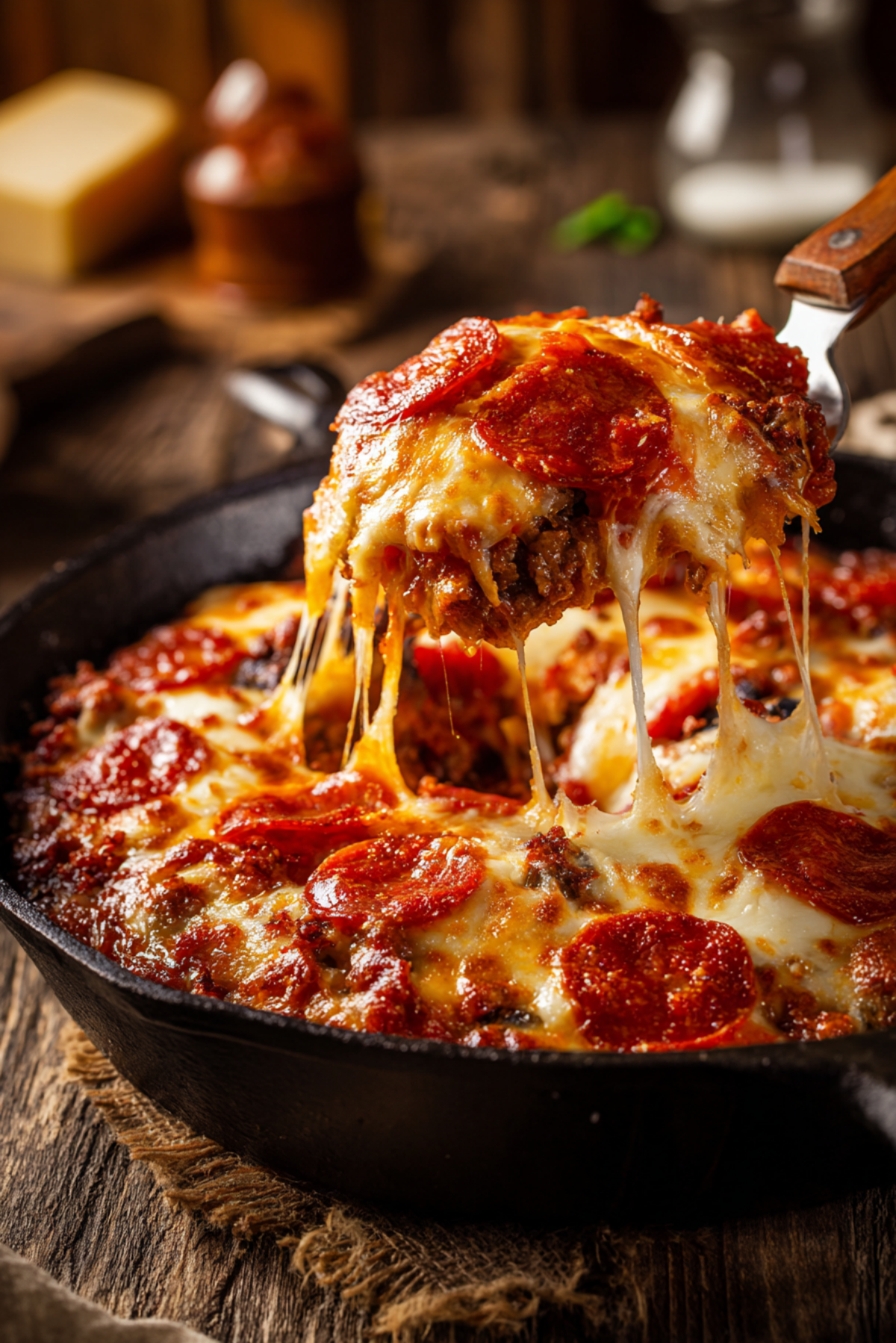 Top with a sprinkle of fresh basil and serve straight from the skillet for that rustic, mouthwatering look. A few extra pepperoni slices on top can crisp up and give it that irresistible, bubbly pizza finish.