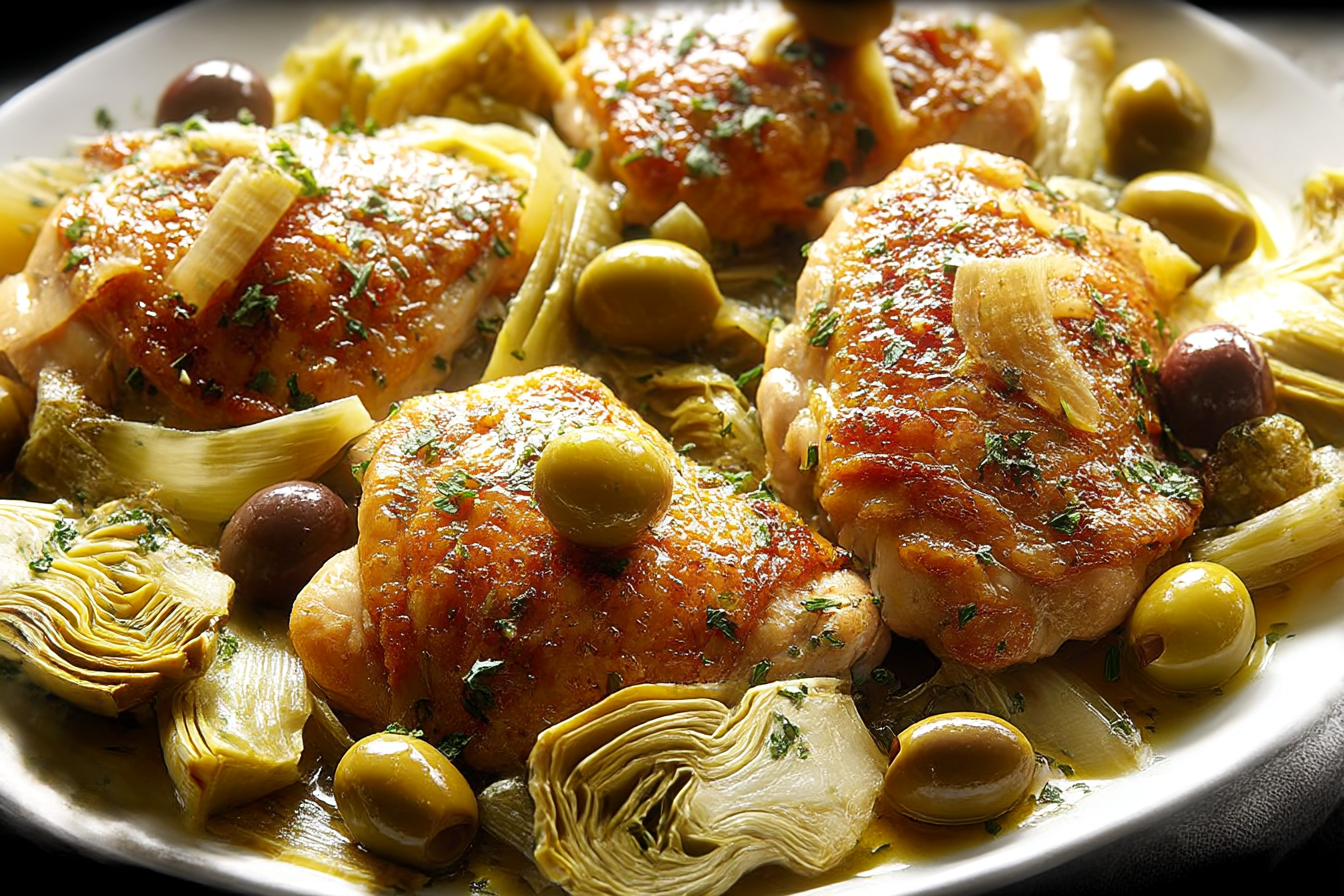 A one-pan Mediterranean-inspired dish featuring golden chicken thighs simmered with briny green olives, tender marinated artichokes, and a lemony herb sauce. This Double-Duty Chicken not only shines at dinner but transforms into delicious leftovers.