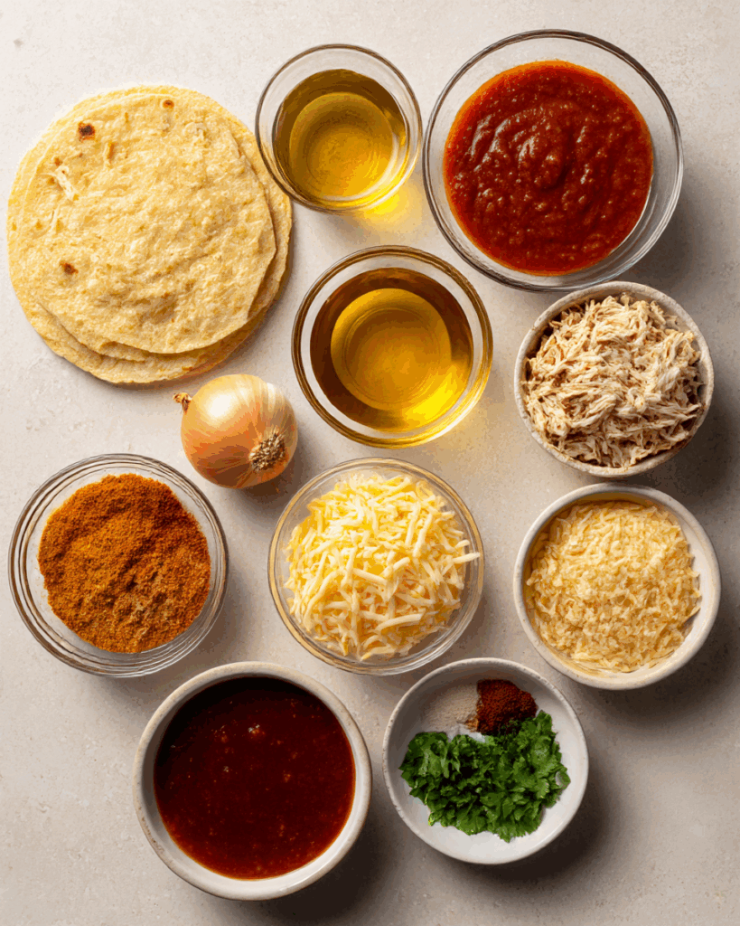 Skillet or comal for toasting chiles and frying tortillas. Medium saucepan to simmer the sauce. Blender or food processor. 9×13 inch baking dish. Tongs or spatula. Fine mesh strainer (optional). Measuring cups and spoons.