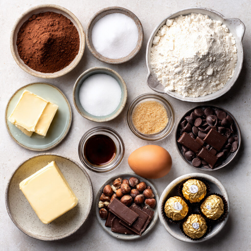 - Chopped Hazelnuts: ½ cup. Adds crunch and echoes the Ferrero flavor.