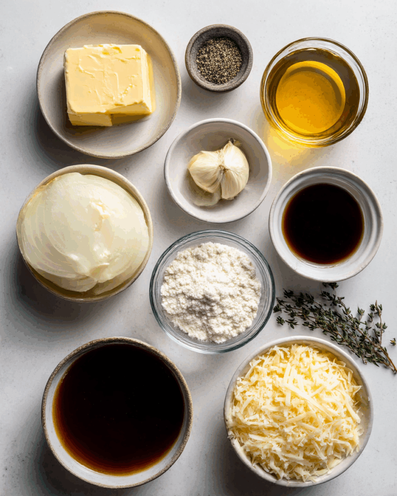 Gruyère Cheese: A classic choice for its superior meltability and nutty, salty flavor that complements the sweetness of the onions.