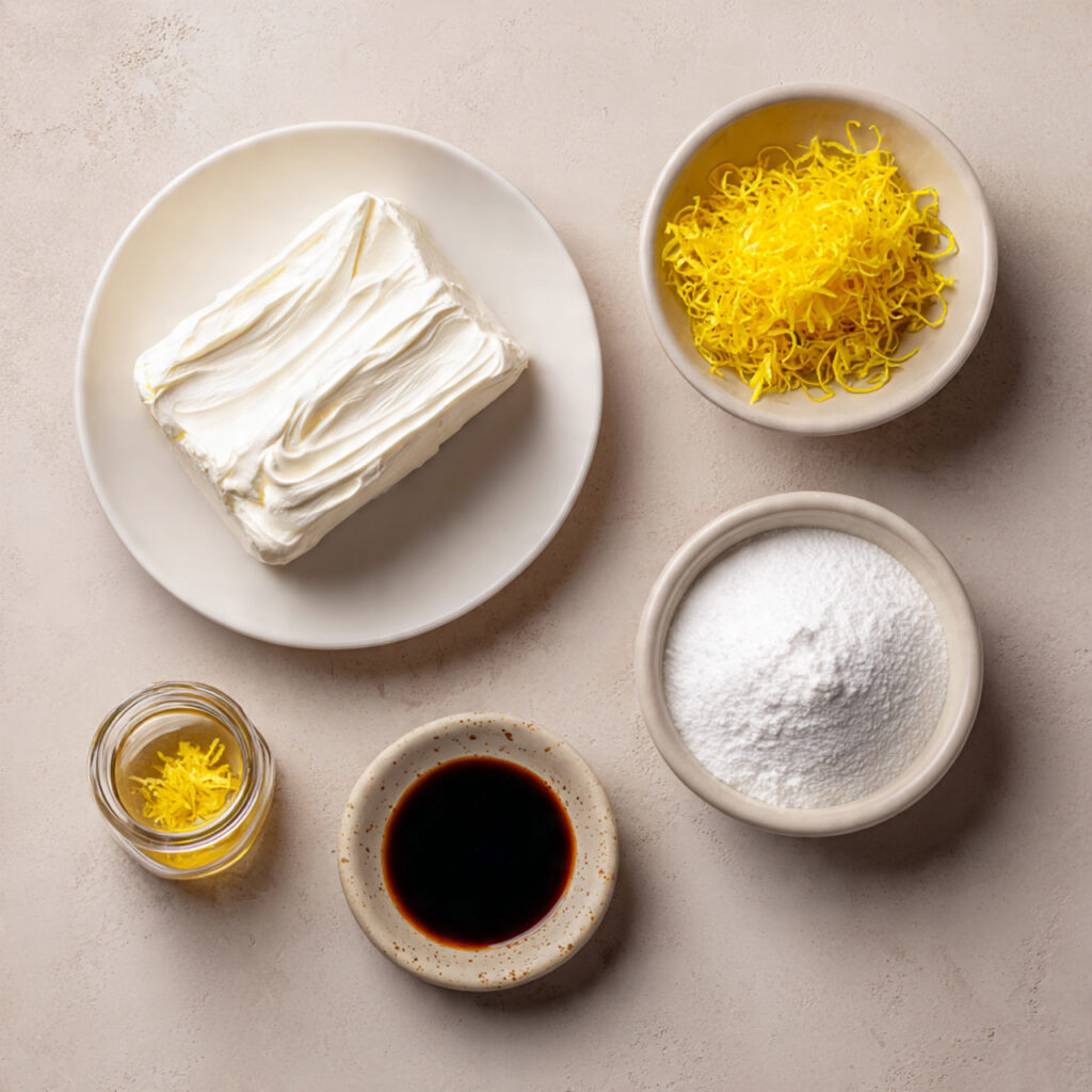 - In a medium mixing bowl, combine softened cream cheese, marshmallow creme, vanilla extract, powdered sugar, and lemon zest.
