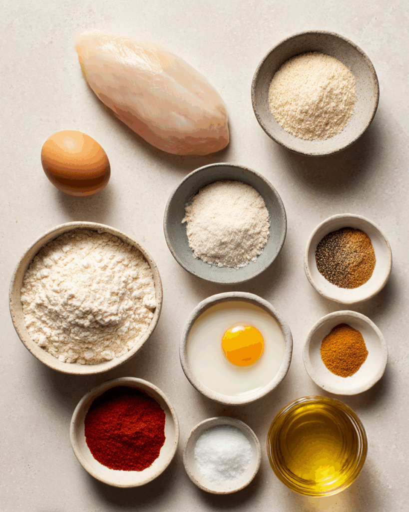 - Oil for Frying: Enough to cover chicken halfway—neutral oil like canola or avocado works best.