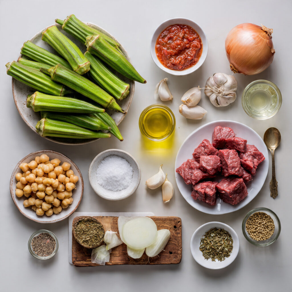 A traditional Tunisian stew featuring tender okra, slow-cooked beef, chickpeas, and a rich tomato sauce, full of warm spices and comforting flavors.