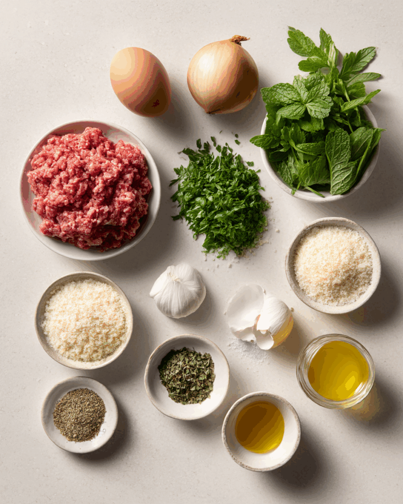 In a large bowl, mix grated onion, garlic, parsley, oregano, mint, breadcrumbs soaked in milk, egg, salt, and pepper. Add the ground beef last and gently mix until just combined.