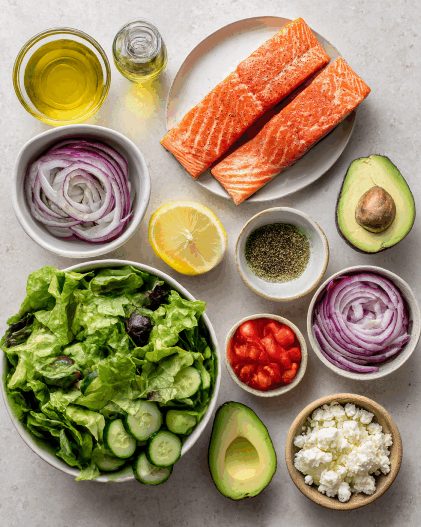 Grilled salmon has long been a staple in coastal cuisines, celebrated for its heart-healthy omega-3 fats and rich, savory flavor. Avocados, native to Central and South America, have become globally loved for their creamy texture and nutrient density. Salad bowls like this one have grown in popularity as a modern culinary trend, blending the clean eating movement with visual appeal and customizable formats. This recipe is a delicious reflection of that global fusion — Mediterranean simplicity meets Californian freshness.