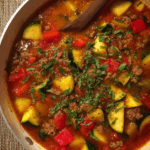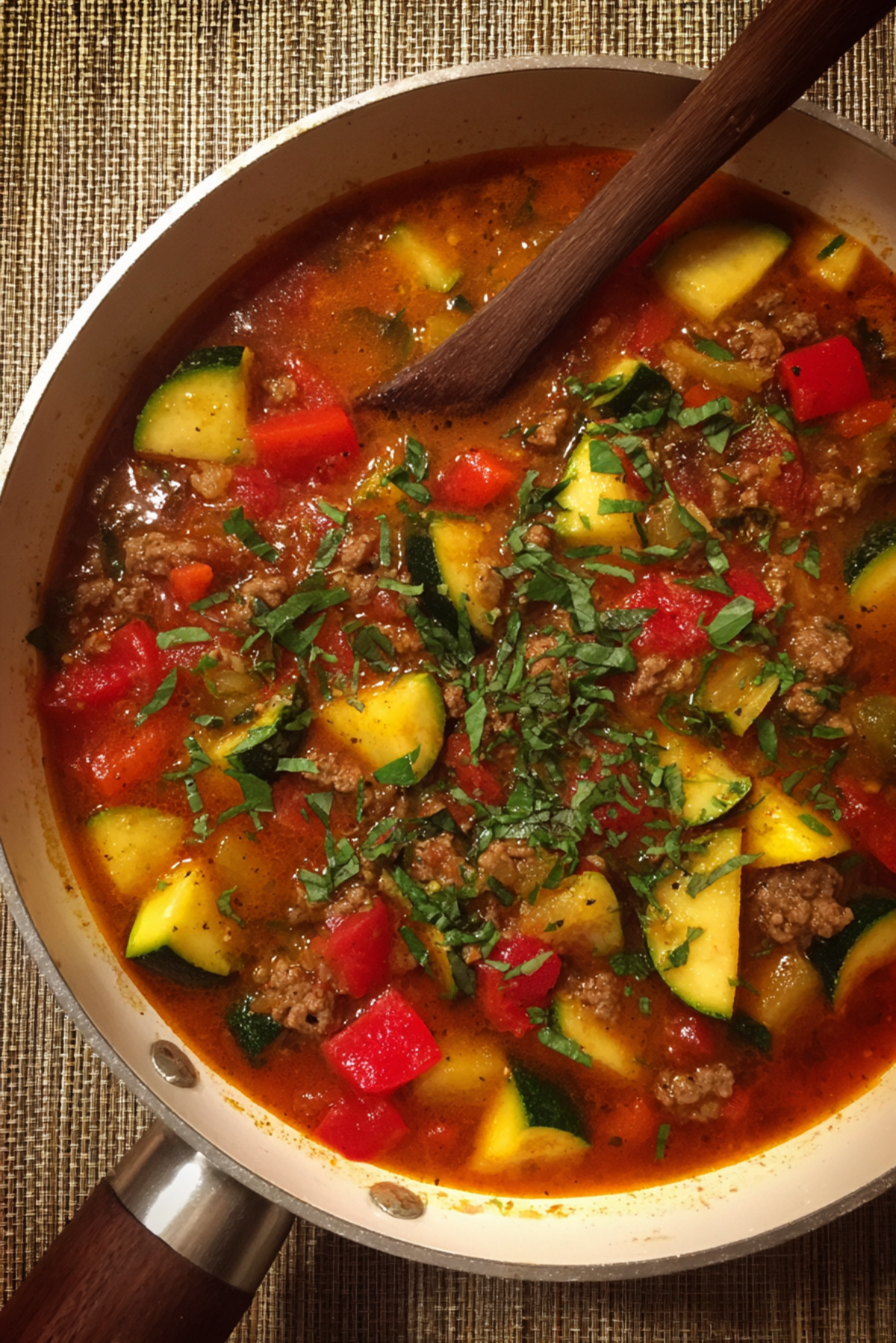 A hearty, one-pot stew loaded with ground beef, zucchini, squash, and bell peppers simmered in a rich tomato broth. Perfect for cozy weeknights or meal prep.