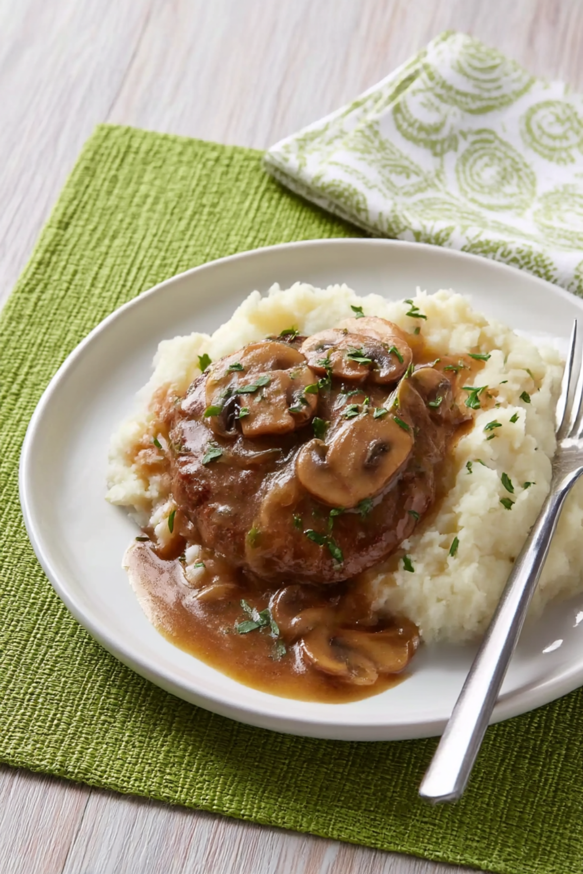 Juicy hamburger steaks seared to perfection and smothered in a rich onion and mushroom gravy. This comforting classic brings savory flavors and nostalgic warmth to your dinner table.