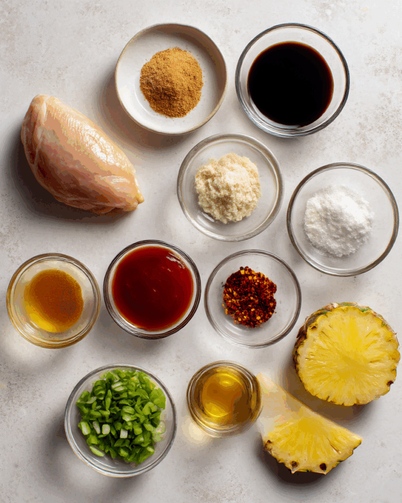- Mix pineapple juice, soy sauce, brown sugar, ketchup, vinegar, sesame oil, garlic, ginger, and sriracha. Marinate chicken in this mixture for 2–12 hours.
