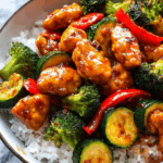 - Cook to Perfection: Add remaining oil, then stir-fry broccoli, zucchini, and red bell pepper for 3–4 minutes. Return chicken to the pan and pour in the sauce.