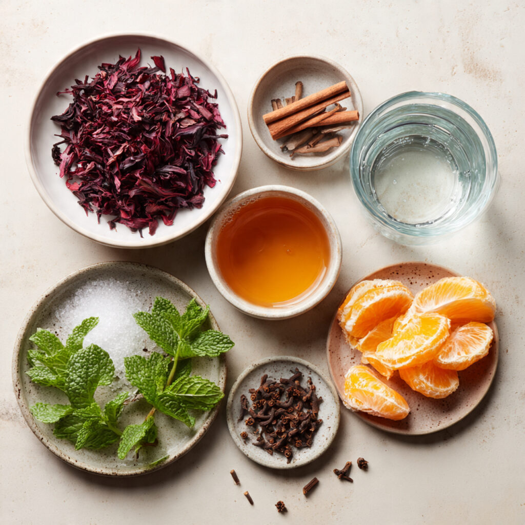 - Dried hibiscus petals: 1/4 cup. The star of the show — tart, floral, and rich in color.