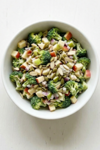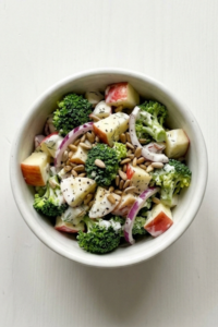 The broccoli stays crisp, the apple adds a juicy bite, and the creamy dressing coats everything lightly. The seeds add a subtle crunch that makes each bite feel balanced and satisfying.