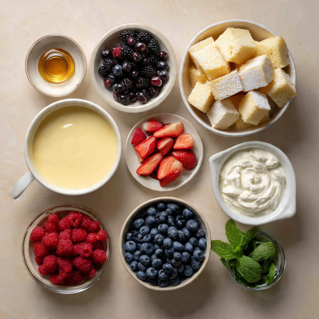 - Pound Cake or Sponge Cake: 1 standard 9×13 cake, baked and cubed. A sturdy base that soaks up lemon and cream without getting soggy.