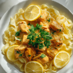 Creamy lemon butter chicken served over soft egg noodles, packed with bright citrus flavor and comforting richness.