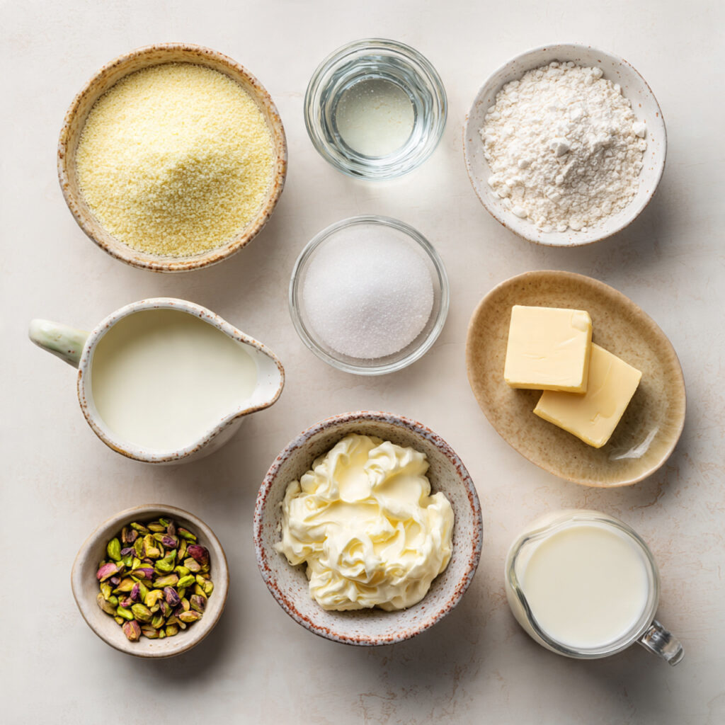 Semolina: This finely ground wheat product is the heart of Mafroukeh. When sautéed in butter and combined with syrup, it becomes soft, fragrant, and slightly nutty — the perfect contrast to the cream layer.