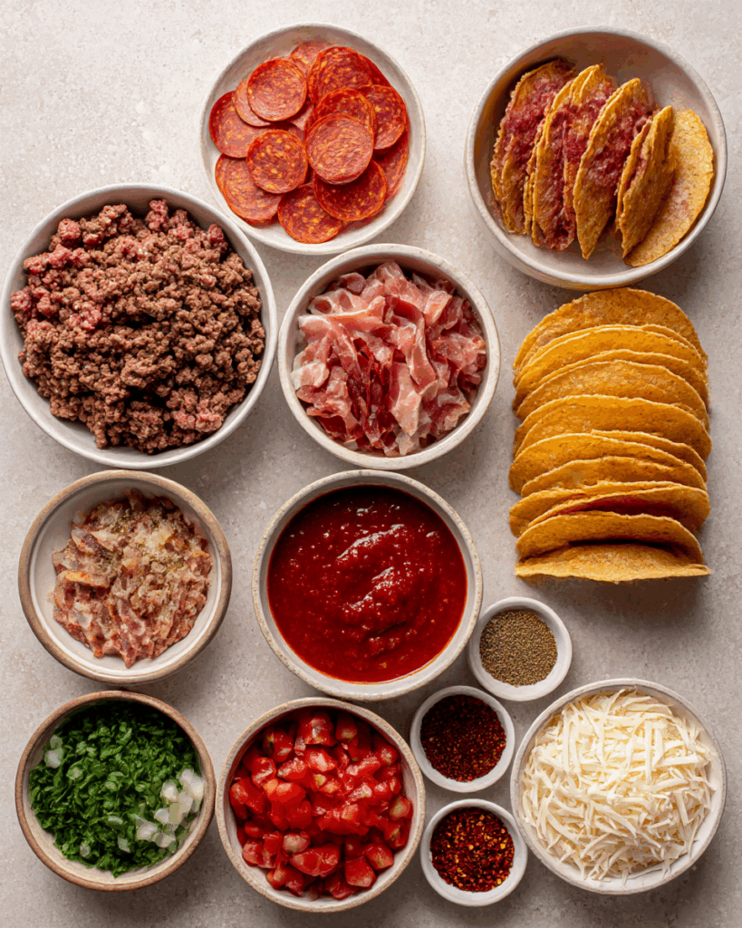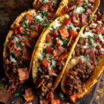 When the craving hits for something bold, cheesy, and satisfyingly meaty, Meat Lovers Pizza Tacos come in hot—literally. These bad boys fuse everything you love about a loaded pizza with the crispy handheld joy of tacos. Each bite is layered with marinara-kissed ground beef, crispy pepperoni, smoky bacon, and gooey melted cheese, all wrapped in golden taco shells. It’s comfort food chaos in the best possible way.