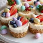 There is something magical about a dessert that looks festive, tastes creamy and indulgent, and yet requires no oven at all. These mini cheesecakes bring that magic straight to your Easter table. With their buttery crumb crust, silky smooth filling, and cheerful toppings, they feel like tiny bites of spring.