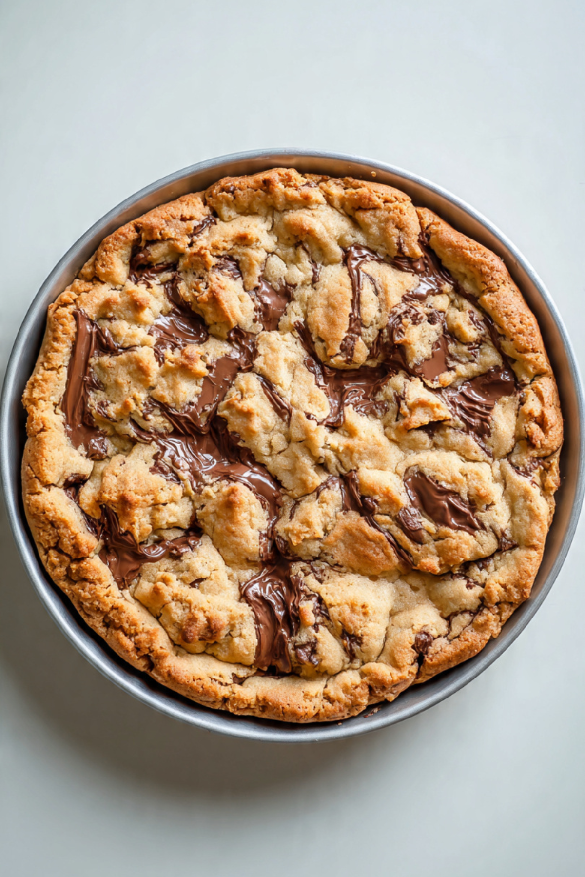 A warm scoopable cookie pie with a gooey Nutella center, crispy edges, and soft chewy texture, perfect for dessert lovers.