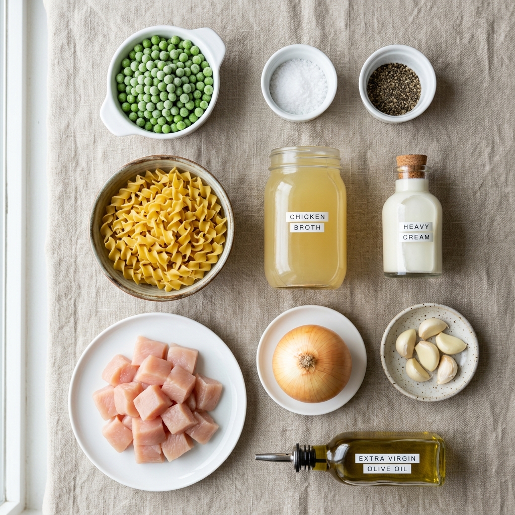 A comforting one pan meal with tender chicken, soft noodles, and sweet peas in a creamy savory sauce.