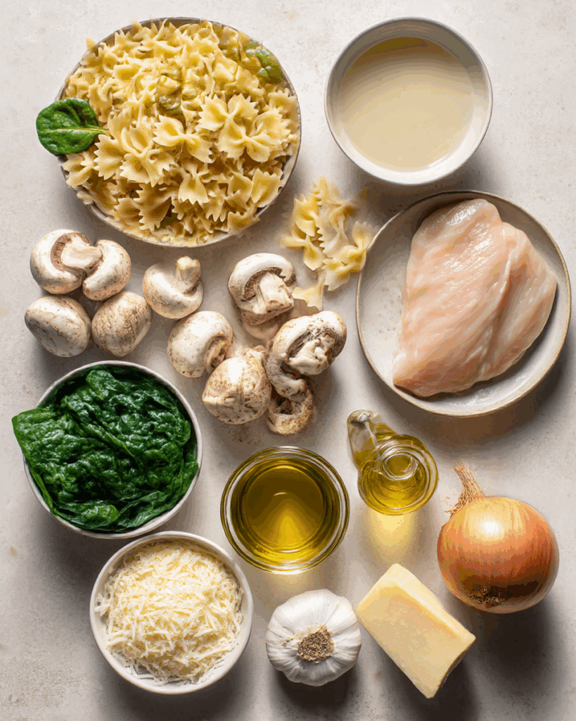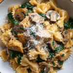 This one-pot chicken and mushroom pasta combines bow-tie pasta, juicy chicken breast, earthy mushrooms, and fresh spinach in a creamy, cheesy sauce—all cooked together in a single pot. It’s a fast, comforting dinner that’s packed with flavor and easy cleanup.